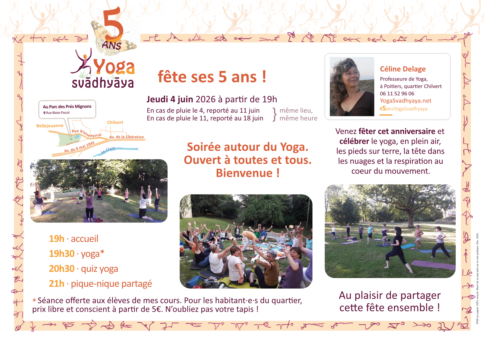 Mercredi 20 mai 2026 - 17:45 Yoga svadhyaya / Studio Anna Weill - 3 rue de l'abbé de l'épée Quartier Chilvert (derrière l'IRJS APSA av. libération). - 86000 PoitiersCours d'1h : postures, renforcement musculaire, assouplissement, respiration, relaxation, méditation. Accessible à tous.tes. Essais et inscription toute l'année. Abo ou carte 5, 10 cours. LUN 17h15+18h30. MAR 12h30+18h00+19h15. MER 17h45+19h. VEN 11h15. Stages yoga-rando. Céline Delage, diplômée IFY