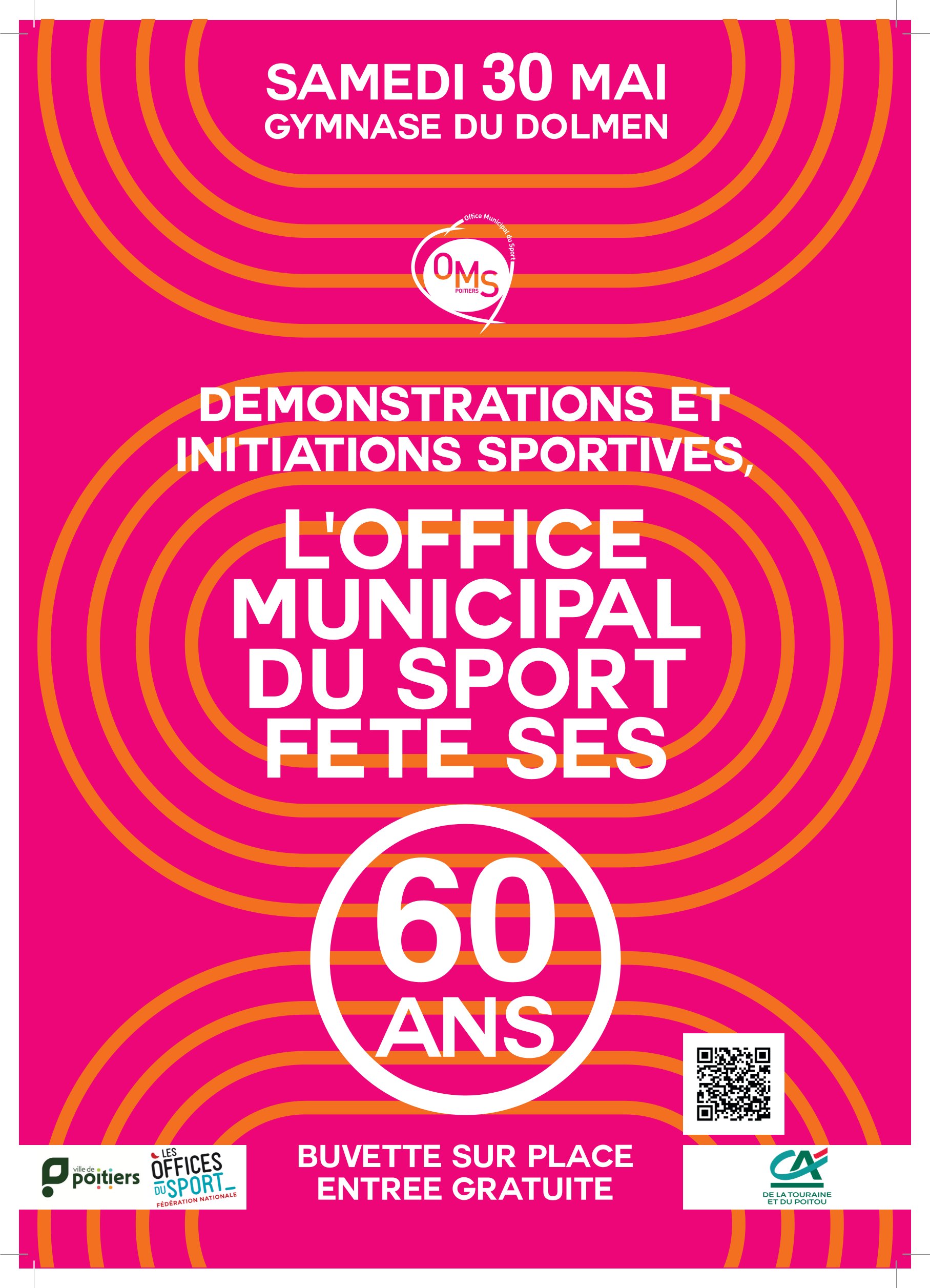 Samedi 30 mai 2026 - 10:00 Gymnase du Dolmen - 71 rue du Dolmen - 86000 POITIERSCette année, l’OMS célèbre 60 ans d’engagement, de passion et de partage autour du sport. Pour marquer cet anniversaire, nous vous invitons à vivre une journée exceptionnelle, ouverte à toutes et à tous. Renseignements : www.oms-poitiers.fr