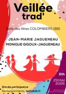 Vendredi 29 mai 2026 - 21:00 Salle des Fêtes - rue Manderen - 86490 ColombiersVenez chanter et danser sur des musiques à danser traditionnelles ou juste écouter lors d'une veillée animée par Jean-Marie et Monique Jagueneau !