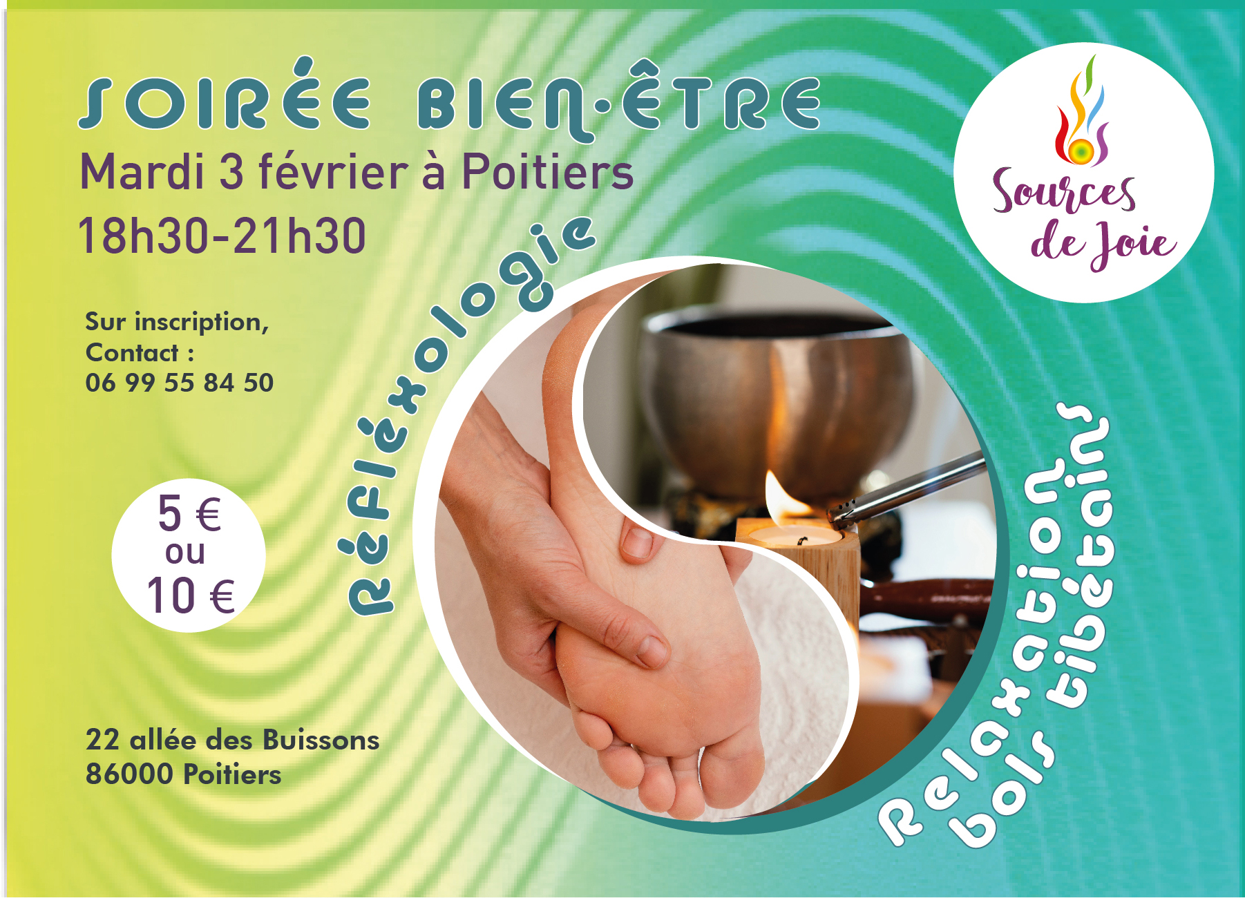 Mardi 03 février 2026 - 18:30 Local Sources de Joie - 22 allée des Buissons - 86000 PoitiersOffrez-vous une pause... Un temps pour ralentir, écouter le corps et apaiser l'esprit. Nous vous invitons à une soirée Bien-être, dans un cadre chaleureux, pour découvrir deux pratiques bienfaisantes: la réfléxologie et la relaxation multi-sensorielle.
