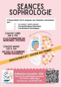Lundi 17 novembre 2025 - 18:00 LA FOURMILIERE DE MONTMIDI - 3 RUE PAUL LANGEVIN - 86000 POITIERSL'Association S.A.F (Soutien Aux Femmes) propose des séances de sophrologie (méditation et gym sensorielle) gratuites pour les femmes souffrant d'un cancer, post-cancer, pathologies féminines, douleurs chroniques et parcours de vie difficiles via une adhésion annuelle de 40€.
